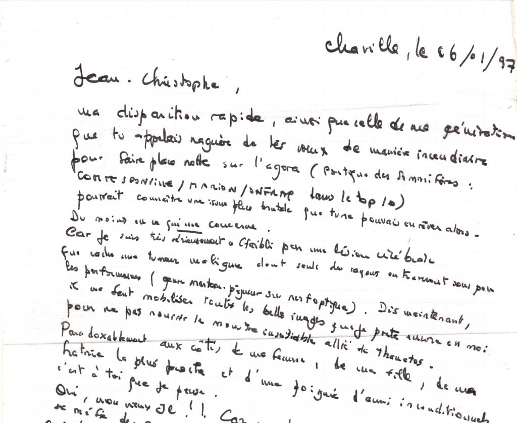 Chaque partie du livre est suivie par des notes, pour donner des références, par une bibliographie, a minima, et par la reproduction d’une lettre (3 pages) adressée à l’auteur, début 1997, par laquelle il évoque son état (la maladie qui menaçait sa vie et qui l’a emporté début 1998), ses difficultés à se faire éditer, ou rééditer, ses projets.